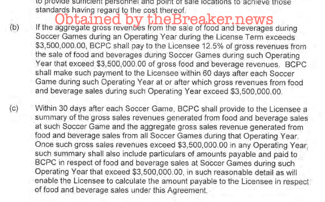 If that happens, then PavCo must pay the Whitecaps 12.5% of gross food and beverage revenues.