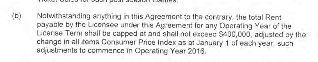 Rent for each game at B.C. Place is 3% of the amount of net ticket sales, but was capped at $400,000 a year. After 2016, the rent ceiling was tied to the consumer price index.